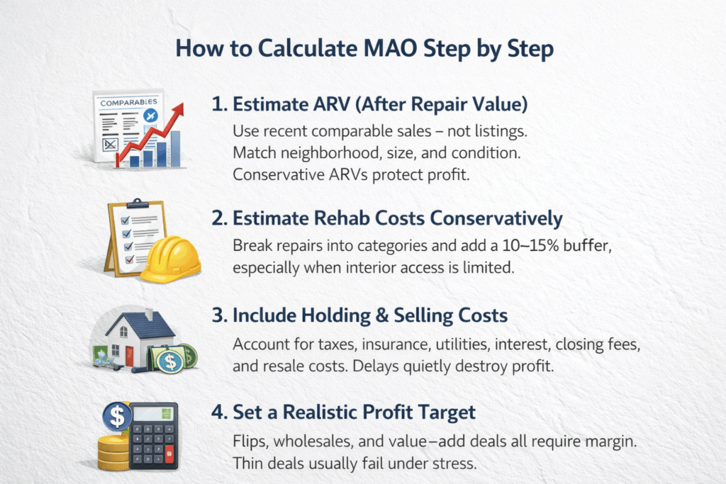 Use this step-by-step process to calculate MAO (Maximum Allowable Offer) with conservative assumptions. This is the same order most investors follow in a real estate deal analyzer so missed costs don’t destroy the deal.