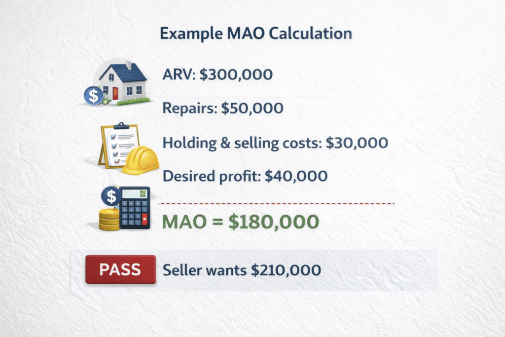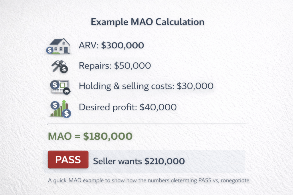 In this scenario, if the seller is asking $210,000, the deal does not meet the MAO threshold. A disciplined investor would either renegotiate or correctly mark this deal as a PASS.