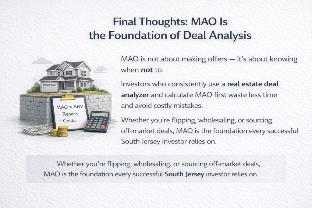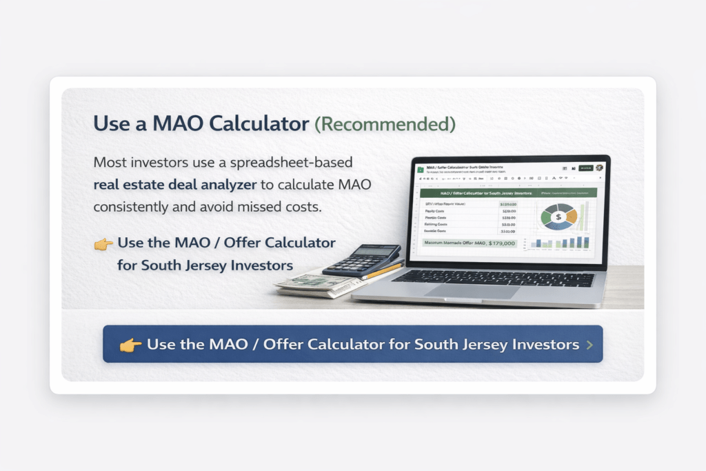 Learn how South Jersey investors calculate MAO (Maximum Allowable Offer) to avoid overpaying, screen deals faster, and protect profit using a repeatable real estate deal analyzer framework.