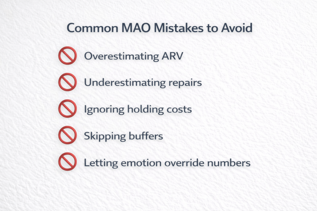 Even experienced investors lose money when they ignore Maximum Allowable Offer (MAO) discipline. These mistakes usually come from rushing numbers or skipping steps in a proper real estate deal analyzer workflow.