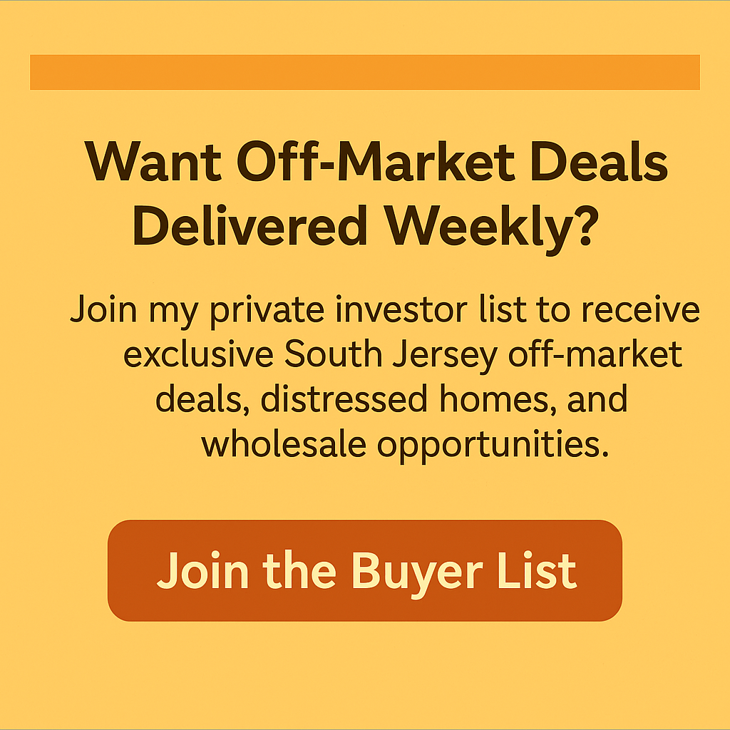 Off-market properties South Jersey buyers are looking for often come directly from trustworthy wholesalers. These hidden opportunities rarely reach the MLS, and wholesalers are typically the first to come across motivated sellers and distressed homes. Building strong relationships with wholesalers is one of the fastest ways to consistently access deals before the general public ever sees them.